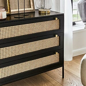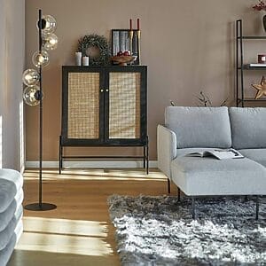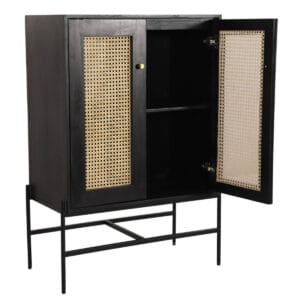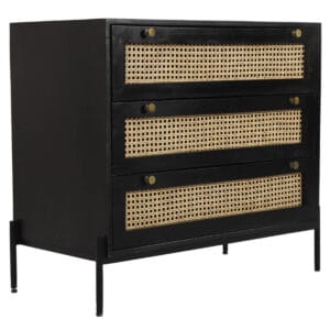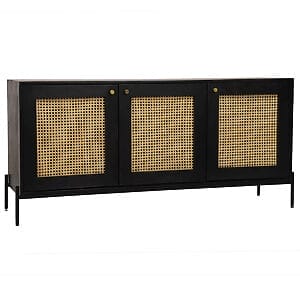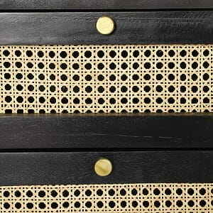 For an industrial inspired, sustainable look to your home, the Rahten Dark Mango Wood Furniture is a luxurious statement piece. Crafted from solid mango wood with a black painted finish, each item in this range is handmade and unique. The golden round pull tab handles contrast beautifully against the light rattan screen on front of doors and some drawers, allowing for subtle décor touches that still have plenty of impact.