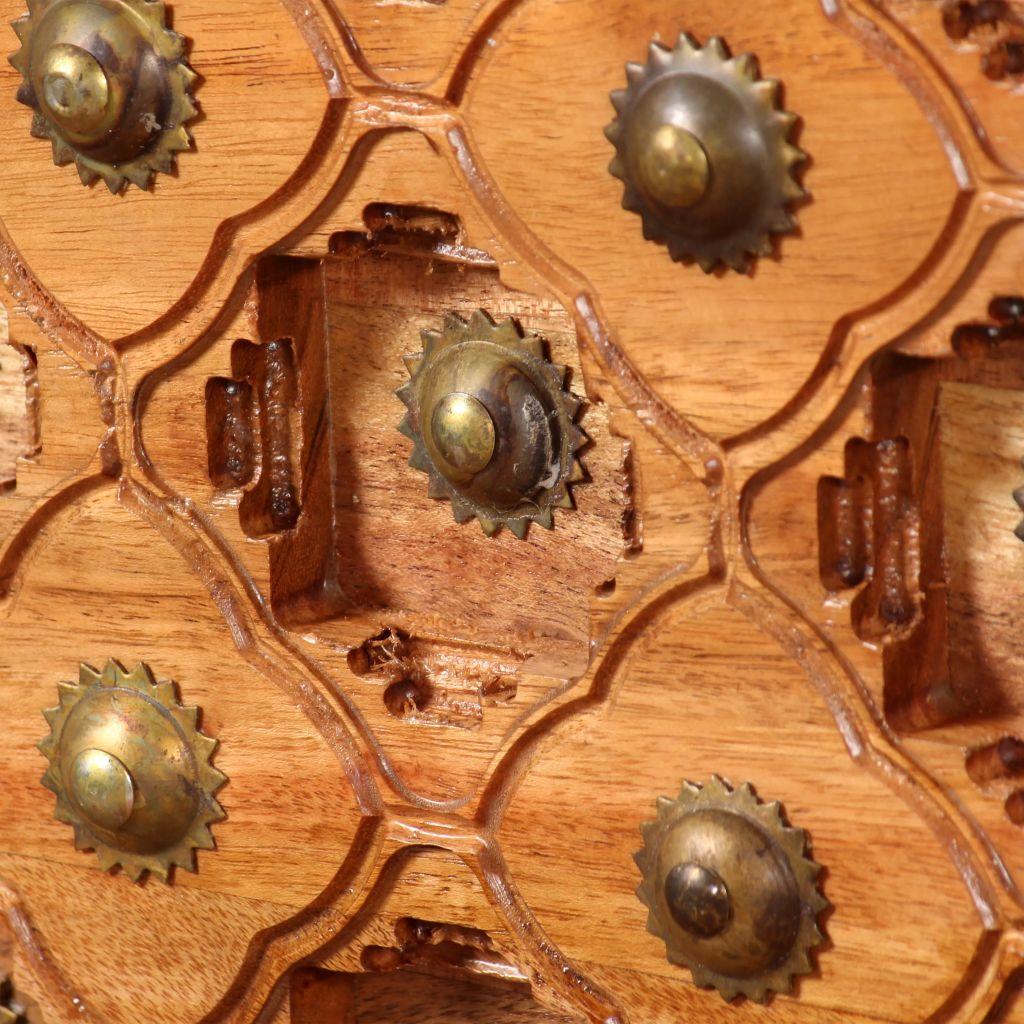 these Acacia wood coffee tables have a unique top that will give your living room décor a dash of colonial flair!. Crafted from solid acacia wood with Sheesham finish, the table is stable, durable, and easy to maintain. Sheesham is a tropical hardwood that is famous for its rich grains and also known as rosewood or Palisander. The sleek glass top is ideal for placing decorative items like fruit baskets, vases or potted plants. The copper studs and the engraved pattern on the top add to the table’s antique charm. Every step of the construction process is carried out with the greatest care, be it polishing, painting or lacquering. Assembly is easy. Important note: The colour and wood grains may vary from piece to piece, making each piece unique and slightly different from the next; the delivery is random.