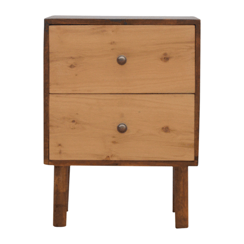 This 2 Drawer Bedside with Oak Wood Drawer Fronts is perfect for bedrooms or living rooms. It’s made from 100% solid mango wood in a chestnut finish, and features two natural oak wood drawers. This gives the piece a lovely contrast between both woods. The bedside table is also very sturdy and well-made, ensuring that it will last for many years to come.