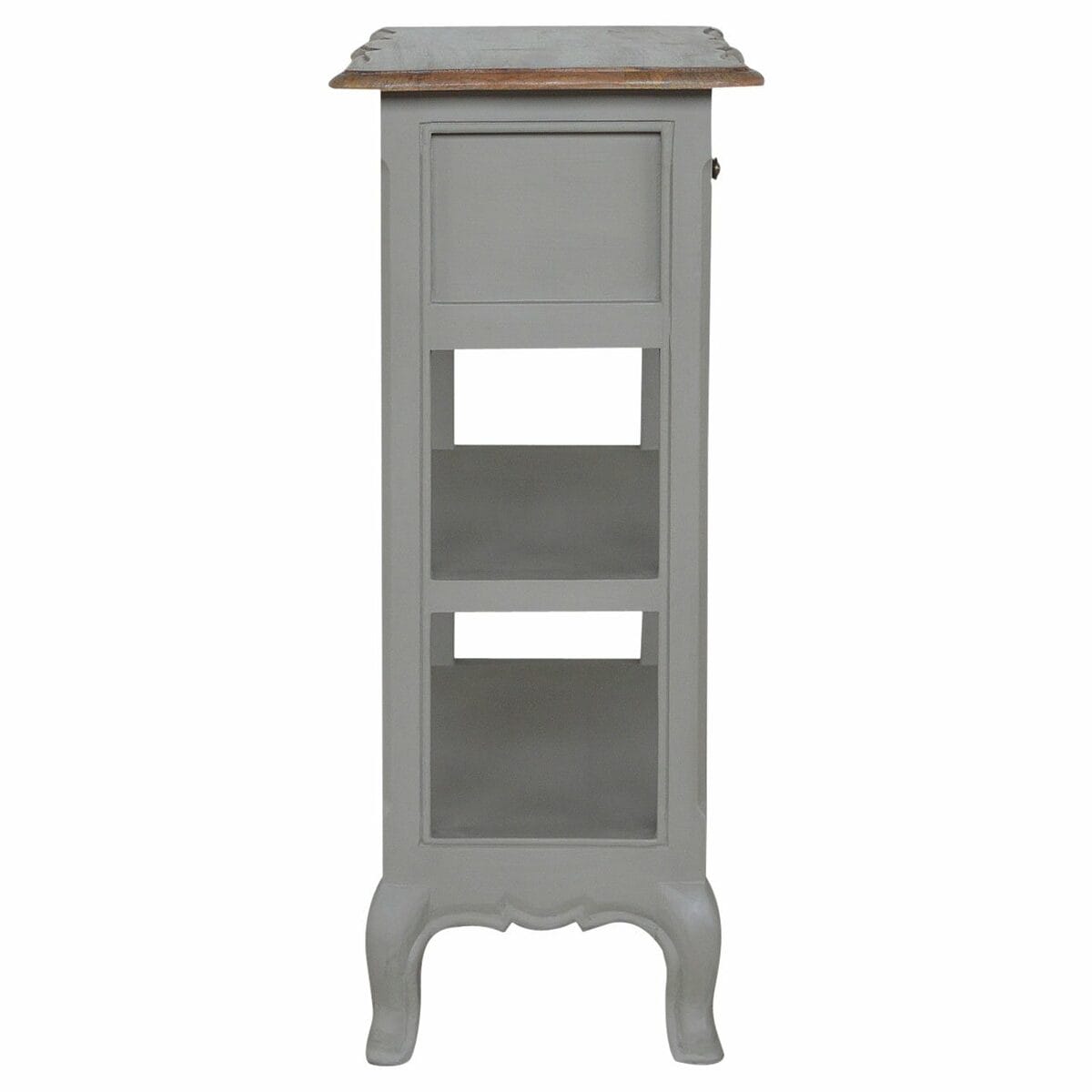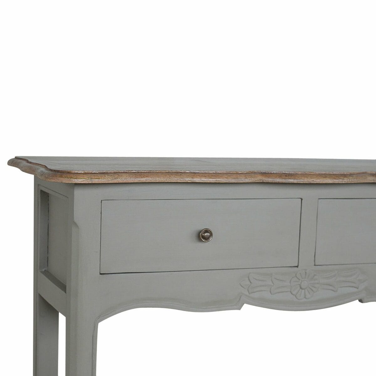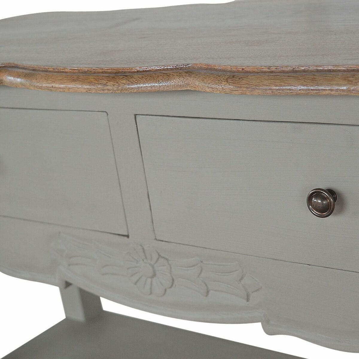 This French Style Console Table is perfect for any room in your home. The two shelves and two drawers provide plenty of storage space, while the solid wood structure and mango wood construction make this French Style Furniture durable and long-lasting. The oak-ish table top and grey painted finish give it a stylish look that will complement any décor. Plus, these Narrow Hall Tables come fully assembled so you can enjoy it right away.