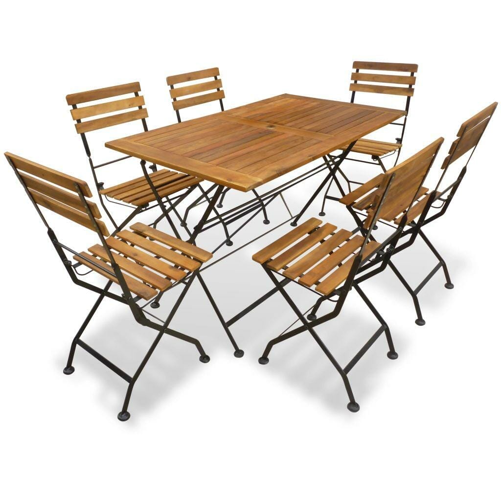 The classic 6 Seater Garden Dining Set Solid Acacia Wood & Metal consists of 1 folding table and 6 folding chairs and will make a great addition to your indoor or outdoor living space. The table and chairs are made of solid acacia wood and sturdy steel, making the set weather resistant and highly durable. The table and chairs can be folded to save space when not in use. The whole set is an ideal choice for al fresco dining in the garden or on the patio. Assembly is easy. Delivery includes 1 table and 6 chairs.