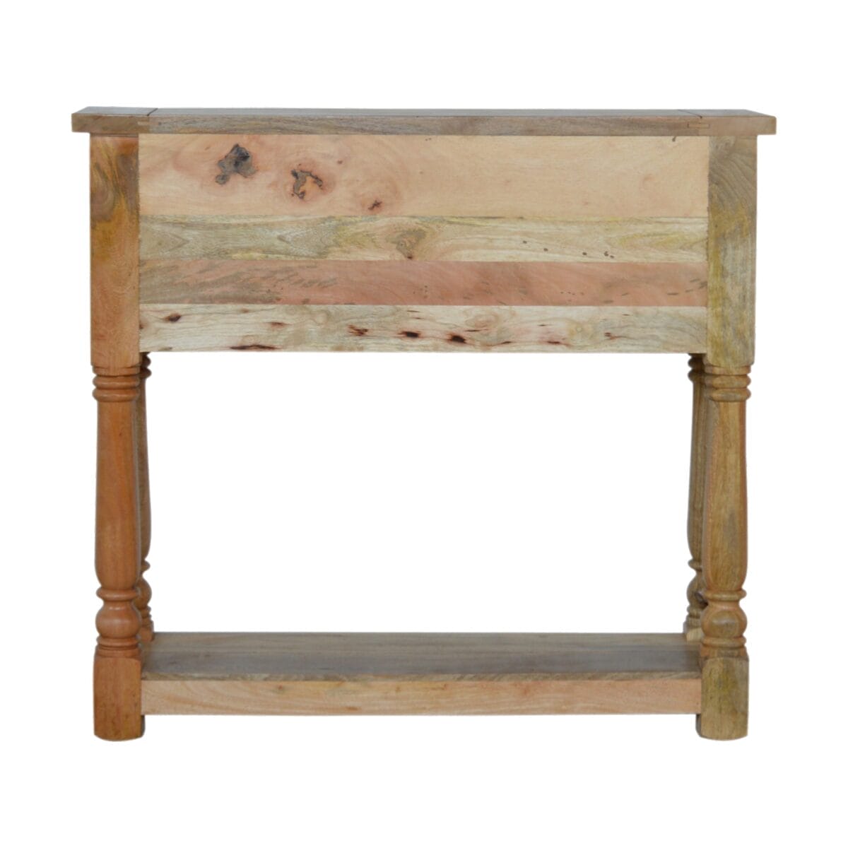 Introducing the Artisan Granary Royale 4 Drawer Console Table. This exquisite piece of furniture is hand-crafted by skilled artisans, and each one is unique. The four drawers and large lower shelf provide ample storage space for all of your belongings, and the brass handles add a touch of traditional elegance. The chunky turned legs and light mango wood finish make this console table both stylish and durable. These Light Wooden Console Tables are also highly sustainable, also being made from solid mango wood they will last for years to come. Perfect for your hallway, living room or office!