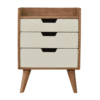 Add a touch of luxury to your bedroom with this Bedside with 3 White Hand Painted Cut-Out Drawers. With its solid wood structure and coned legs, it’s both sturdy and stylish. The mango wood is crafted by hand, and the white painted drawer fronts add a touch of elegance. Plus, the oaky colour of these Solid Wood Bedside Chests is perfect for any room and décor.