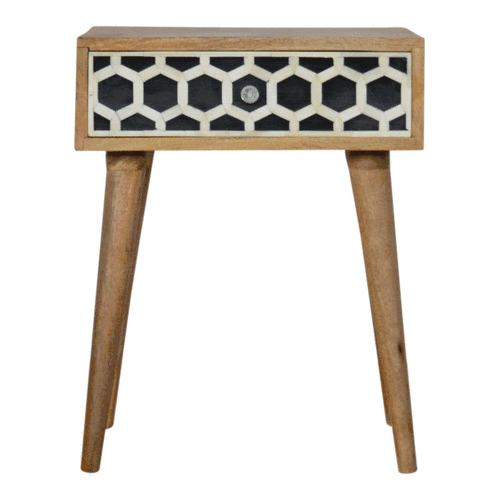 This Bone Inlay Bedside Table is constructed from 100% solid mango wood, and finished with a fine oak-ish finish. The drawer features a glass knob, and the table has 4 Scandinavian styled legs. The bone inlay used in these Solid Wood Bedside Chests is sourced responsibly from deceased animals, such as camels, goats and buffaloes. This table is versatile and stylish, and would make a great addition to any home.