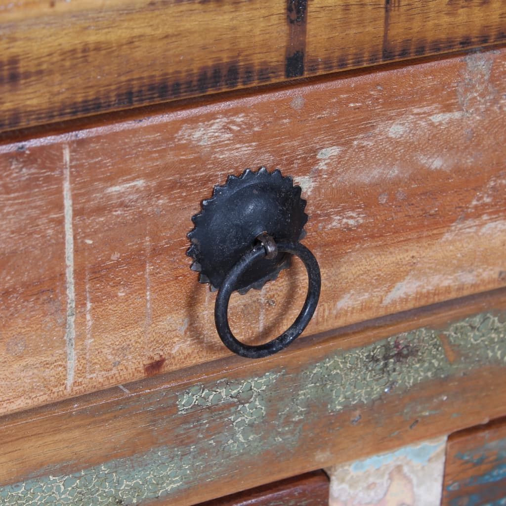 This industrial-style coffee table exudes a vintage charm and will make a timeless addition to your home. The coffee table can also be used as a side table or end table. The retro coffee table is handmade of reclaimed wood which is stable, durable and beautiful, and has the characteristics of different woods like sheesham, teak, palisander, mango wood, acacia, recycled wood, hard wood, etc. Every step of the process is carried out with the greatest care, be it polishing, painting or lacquering. The craftsmanship and the beautiful wood grains make every piece of our Handmade Furniture unique and slightly different from the next. In addition, the 5 drawers and the large interior compartment provide ample space for any items you’d like to keep within reach. Important note: The colours vary from piece to piece, making each of our tables unique; the delivery is random.