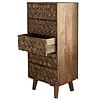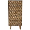 Combining contemporary style and classic function, this Geometric 5 Drawer Tall Chest is the perfect addition to any modern home. The intricate geometric block pattern on the drawer fronts adds a unique touch and creates a beautiful visual appeal. Crafted from solid mango wood and finished in a light wood color, this piece is handmade with scandinavian style feet for enhanced stability.