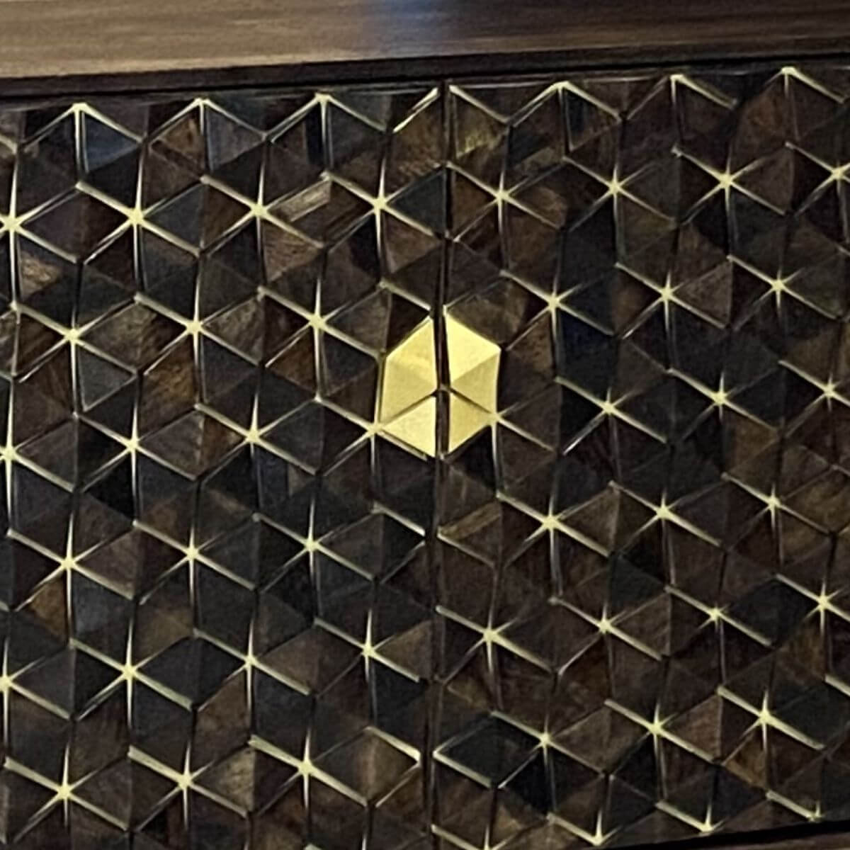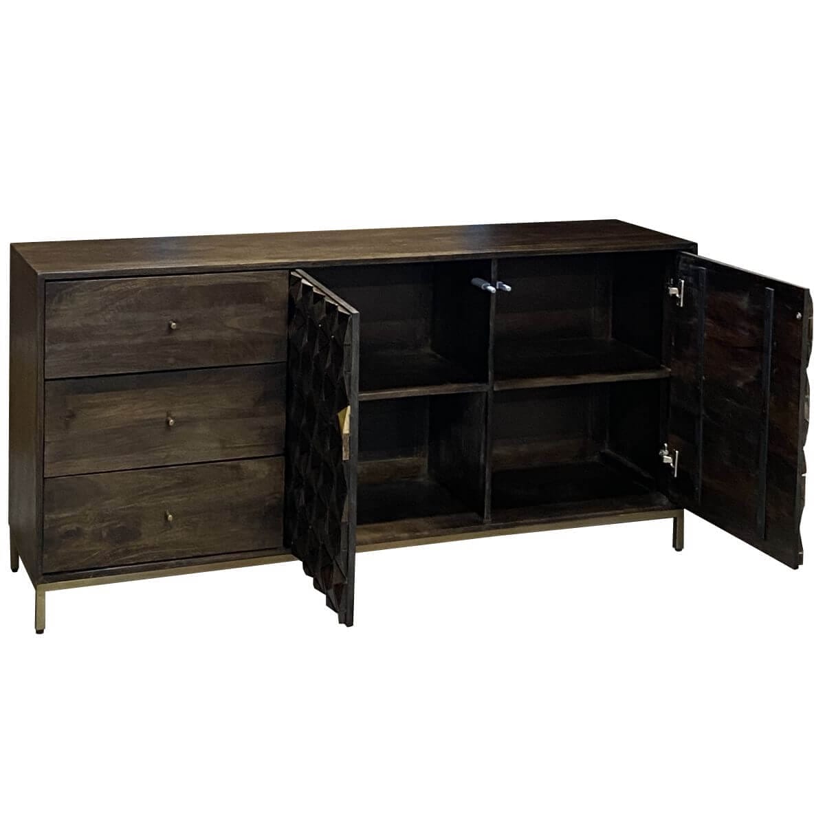 The Golden Gem Dark Mango Large Sideboard 160cm is an eye-catching piece of furniture that will add a touch of style and sophistication to any room. Impress your guests with the intricate diamond pattern, which has been CNC cut from mango wood in a dark walnut hue for maximum visual appeal. For added luxury, the sideboard features gold metal feet frame and golden push-to-open handles that provide both structural support and elegant design.