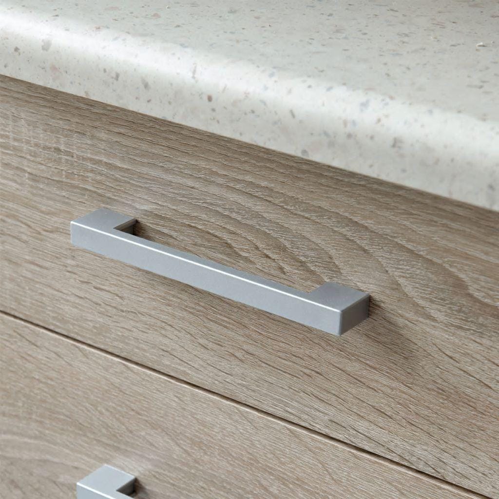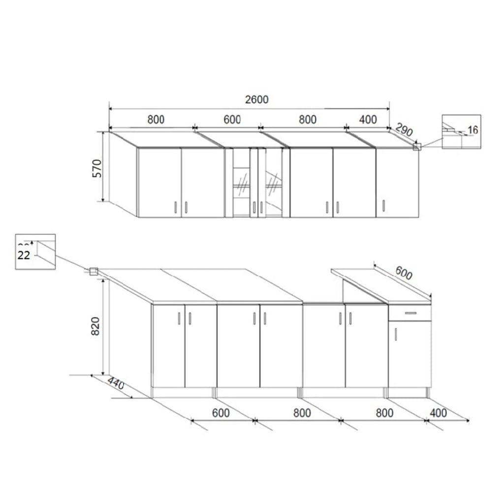 Colour: OakCabinet specifications:1 x Top unit with two glass doors: 600 x 290 x 570 mm (W x D x H)2 x Top unit with two doors: 800 x 290 x 570 mm (W x D x H)1 x Top unit with one door: 400 x 290 x 570 mm (W x D x H)1 x Base unit with one door and one drawer: 400 x 440 x 820 mm (W x D x H)1 x Base unit: 800 x 440 x 820 mm (W x D x H) (designed for sink)1 x Small base unit: 600 x 440 x 820 mm (W x D x H)1 x Large base unit: 800 x 440 x 820 mm (W x D x H)Board thickness: 16 mmWith wood grain finishWorktop specifications:Worktop thickness: 28 mmWorktop depth: 600 mm