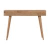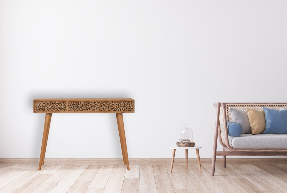The Lisbon Console Table is a beautiful and functional piece of furniture that will elevate any space. This console table is made from 100% solid mango wood, making it sturdy and durable. The oak-ish finish and shiny knobs on the Nordic style legs give this piece a lovely contrast that will complement any décor. The three Wood Resin Inlay drawers provide ample storage space for your convenience.