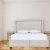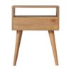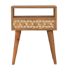 The Maine Bedside is perfect for those who appreciate simple, modern design and quality craftsmanship. This piece is handmade from mango wood and features a beautiful oak-ish finish. The front of the drawer is adorned with a modern pattern in white resin, and the legs are sleek and Scandinavian-inspired. The bedside also has one open slot shelf, perfect for storing books or other items.