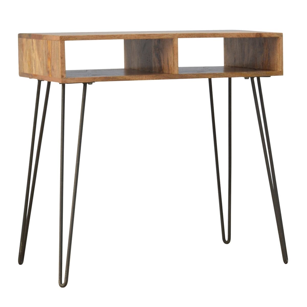 This Mango Wood Writing Desk And Stool With Iron Legs is a beautiful, handmade writing desk with two compartments, a matching stool seat and hairpin-style legs. These Solid Wood Writing Desks are finished in a light oaky colour finish that will complement any room, and the solid mango wood construction makes it a durable piece of furniture that will last for years. This fine Handmade Furniture is perfect for use as a home office desk or in a study, and the stylish iron legs add a touch of elegance and Industrial flare.