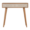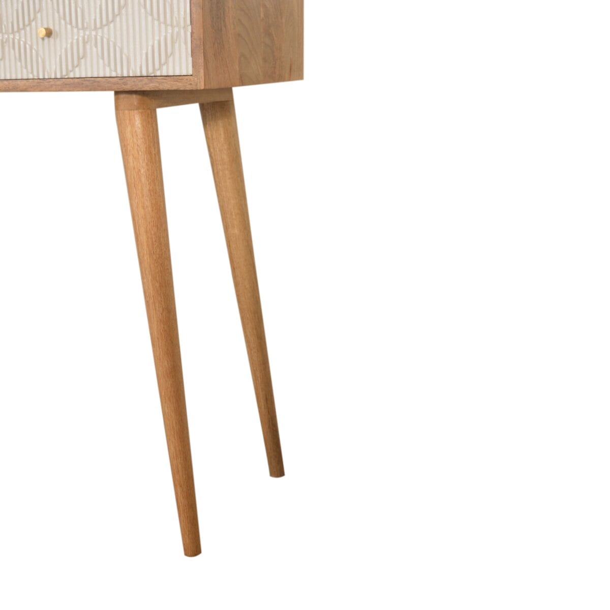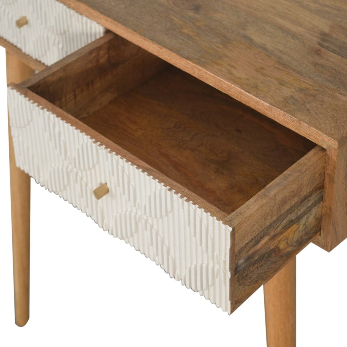 This beautiful Milan White Console Table will add a touch of elegance to any room. It is crafted by hand from solid wood, and features two carved drawers with painted white fronts. The nordic scandinavian style legs are made from mango wood, and the oak-ish white finish gives it a warm, inviting look.