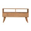 The Prima TV Unit is a beautifully crafted piece of furniture that will add a touch of elegance to any living room or den. The solid wood structure and geometric pattern drawer fronts are eye-catching, and the two drawers provide ample storage for all your media needs. These Mango Wood TV Units are crafted by hand and have a lovely oak-ish finish that is both unique and stylish.