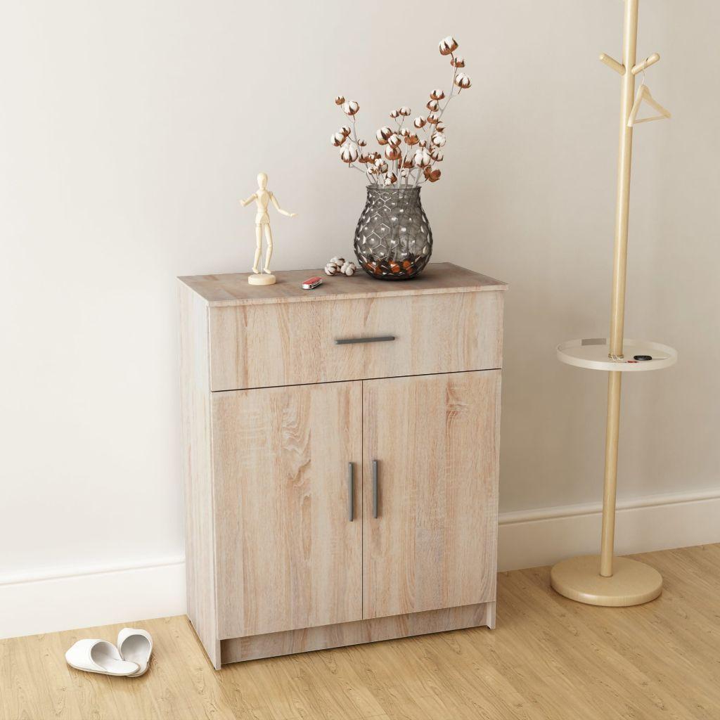 With its practical utility, the sideboard will become an ideal complement in your room. The sideboard is made of chipboard. It consists of 1 drawer and a 2-door cabinet to provide ample storage space for your various items, making your room tidy and clean. Wall mounting accessories and a wall anchor to prevent the sideboard from tipping over are included in delivery. This durable storage cabinet is easy to clean. Assembly is easy.