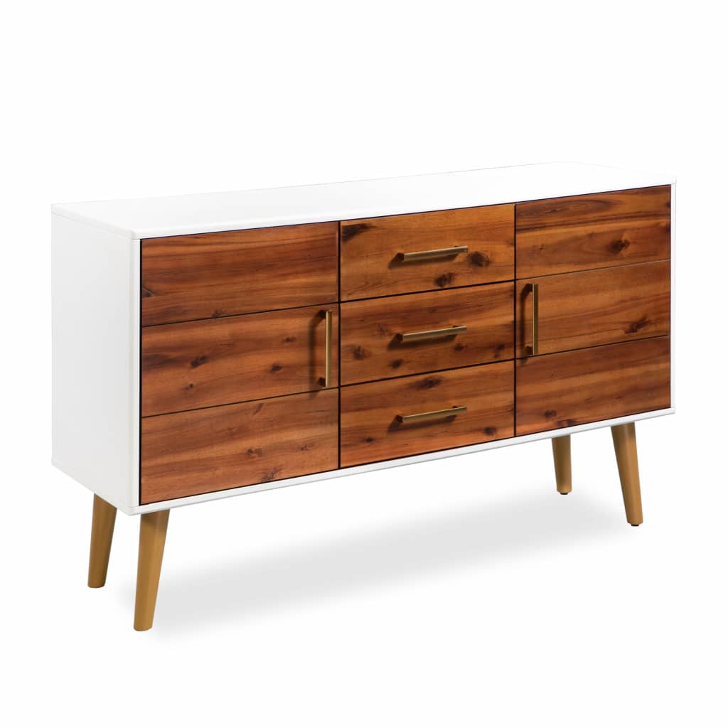 Our high-quality sideboard has a stylish design and will make a great addition to your living room, dining room, hallway etc. These Acacia Wood Sideboards are expertly crafted from solid acacia wood and high-quality MDF. The furniture is handmade and very sturdy and also durable and built to last. It has three drawers and two doors, which provide ample storage space for books, media carriers and other items. The drawers and cabinet doors have brass-look handles that add to the retro style while the top is ideal for displaying decorative objects, photo frames, or potted plants. Assembly is easy.