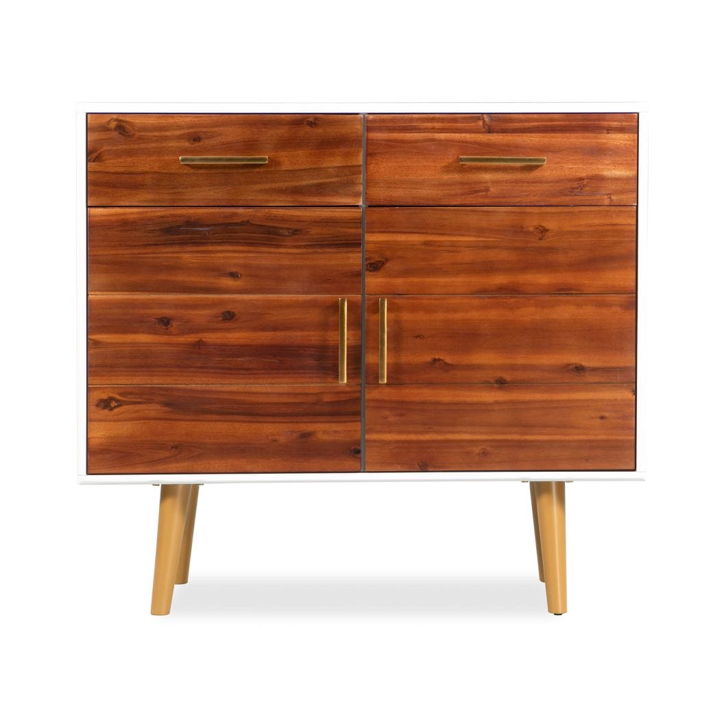 Our high-quality sideboard has a stylish design and will make a great addition to your living room, dining room, hallway, etc. These Acacia Wood Sideboards have been expertly crafted from solid acacia wood and high-quality MDF board, making it very sturdy and durable. It has two drawers and two doors, which provide ample storage space for books, media carriers and other items. The drawers and cabinet doors have brass-look handles that add to the retro style. The top is ideal for displaying decorative objects, photo frames, or potted plants. Assembly is easy.