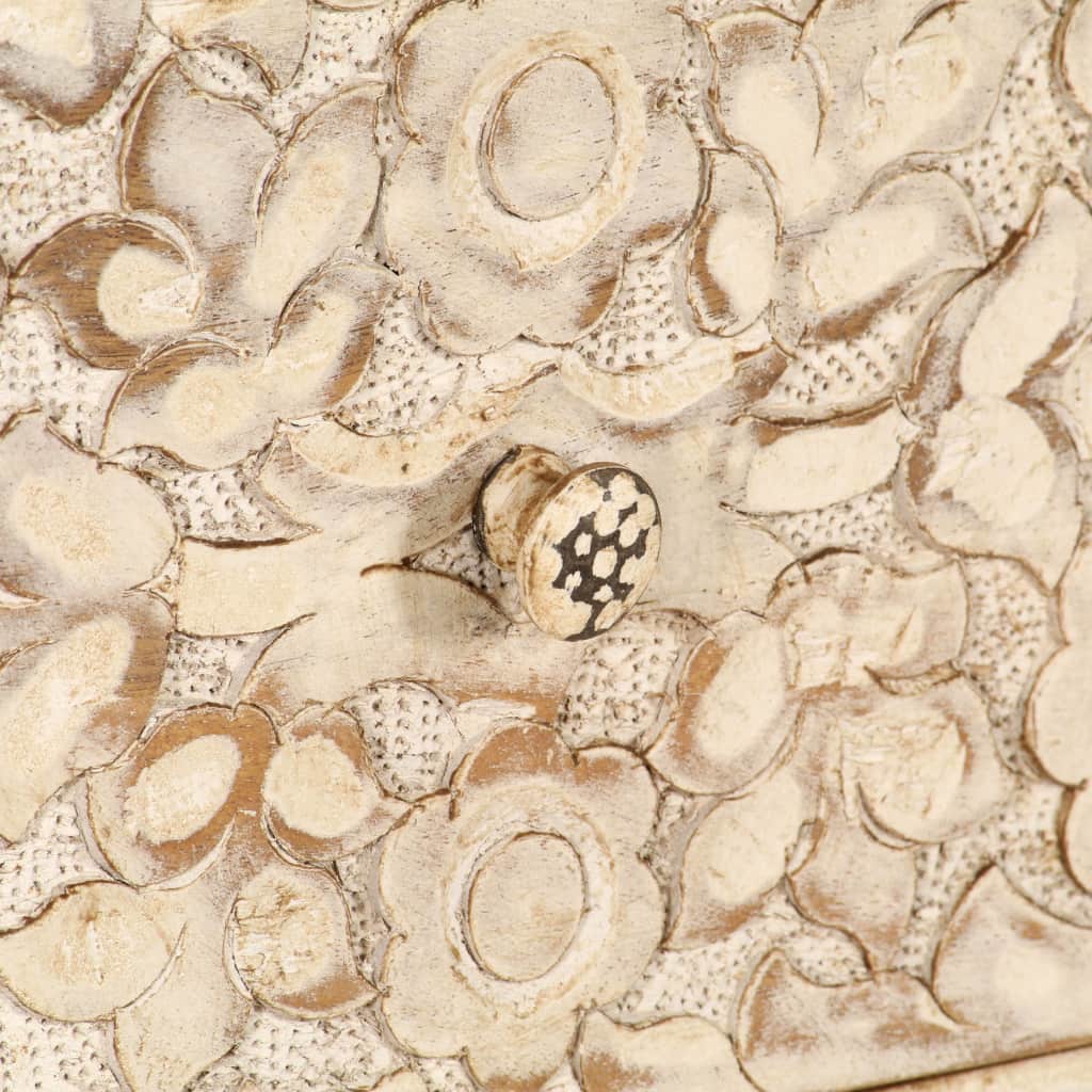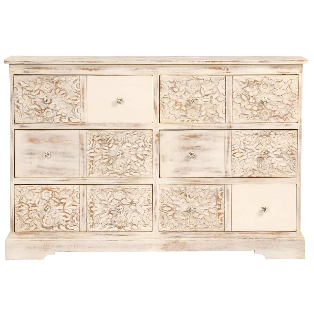 This wooden sideboard with exquisite decorative details is the way to go if you are looking for a piece of furniture in the beach house style. The side cabinet is made of solid mango wood which is stable, durable and beautiful. The craftsmanship adds to its spectacular retro style. The mango wood has been treated in a distinctive style to make it more wear resistant. The sideboard has large drawers which provide ample storage space for keeping clothes, books, etc. organised, while the sturdy top is ideal for displaying decorative items, like vases, photo albums, fruit baskets, etc. This large sideboard provides a perfect storage solution but also makes for an elegant accent piece. It has a classic design that will never go out of style and will suit almost any interior. You will be impressed by its storage space and refined look! The sideboard is easy to assemble.