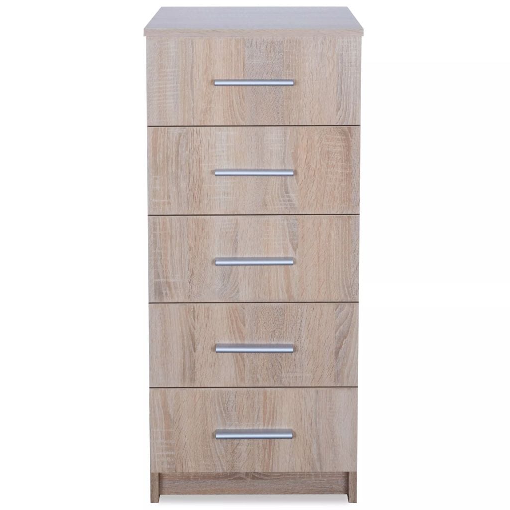 This tall chest of drawers has a sophisticated oak-look finish that will give your home decor a touch of elegance. This cabinet is made of chipboard. It has 5 drawers and makes an ideal storage solution for clothing and smaller items. Two wall anchors to prevent the sideboard from tipping over is included in delivery. This durable storage cabinet is easy to clean. Assembly is easy.