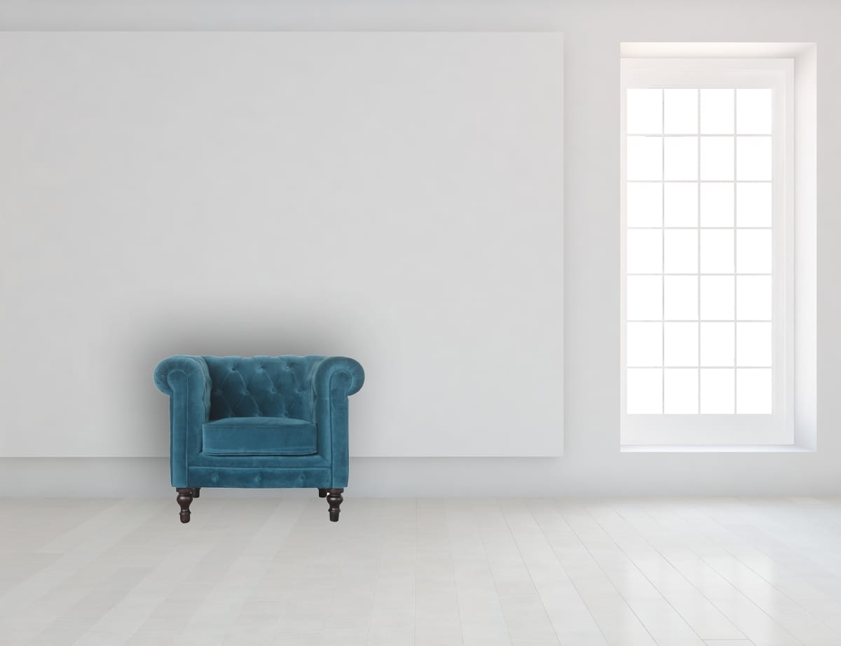 This Teal Velvet Chesterfield Armchair is upholstered in a luxurious teal cotton velvet and features 4 turned feet constructed from 100% solid mango wood in a walnut finish. This sofa is detailed with deep button tufts, piping, and exquisite craftsmanship. It’s the perfect addition to any room wanting a touch of luxury and style.