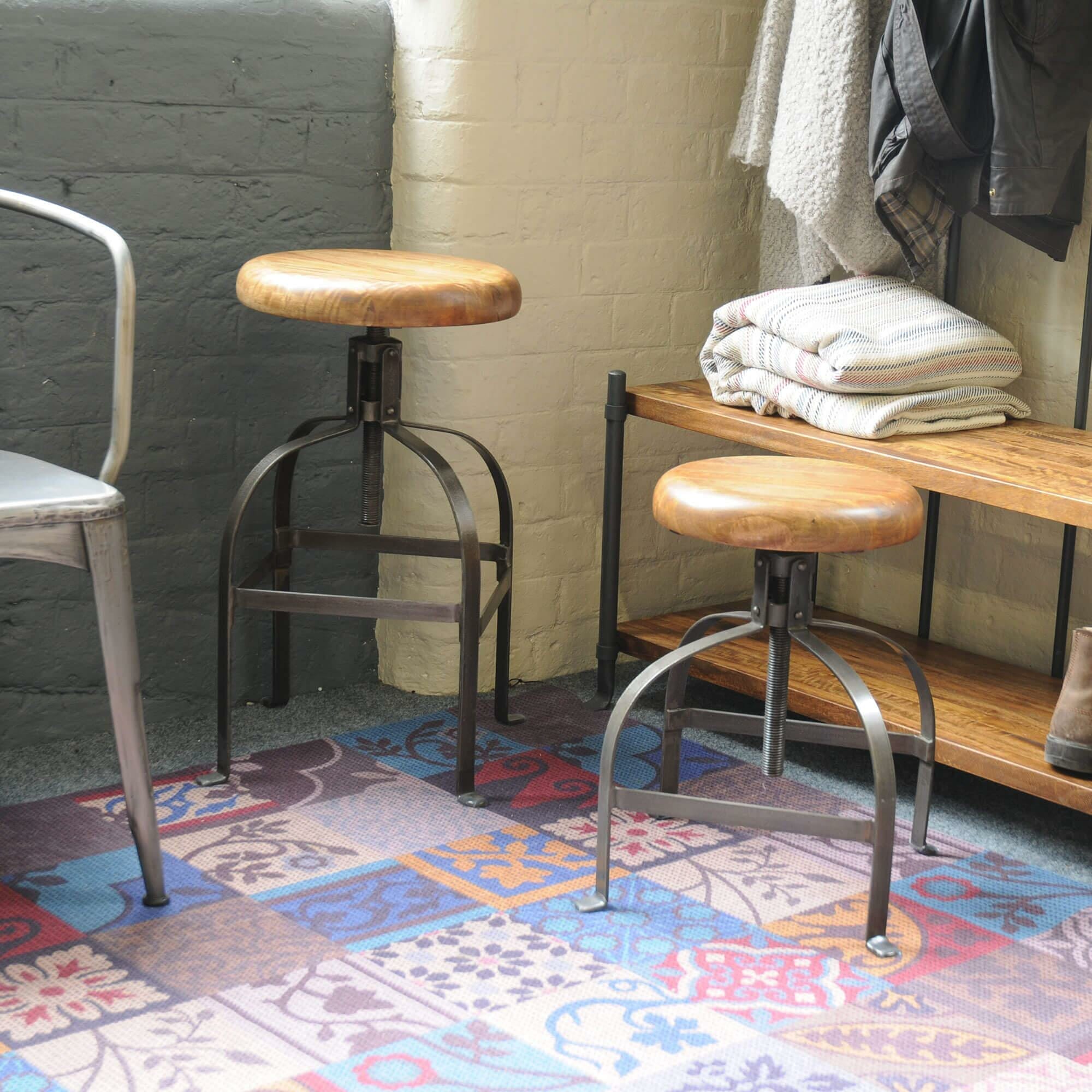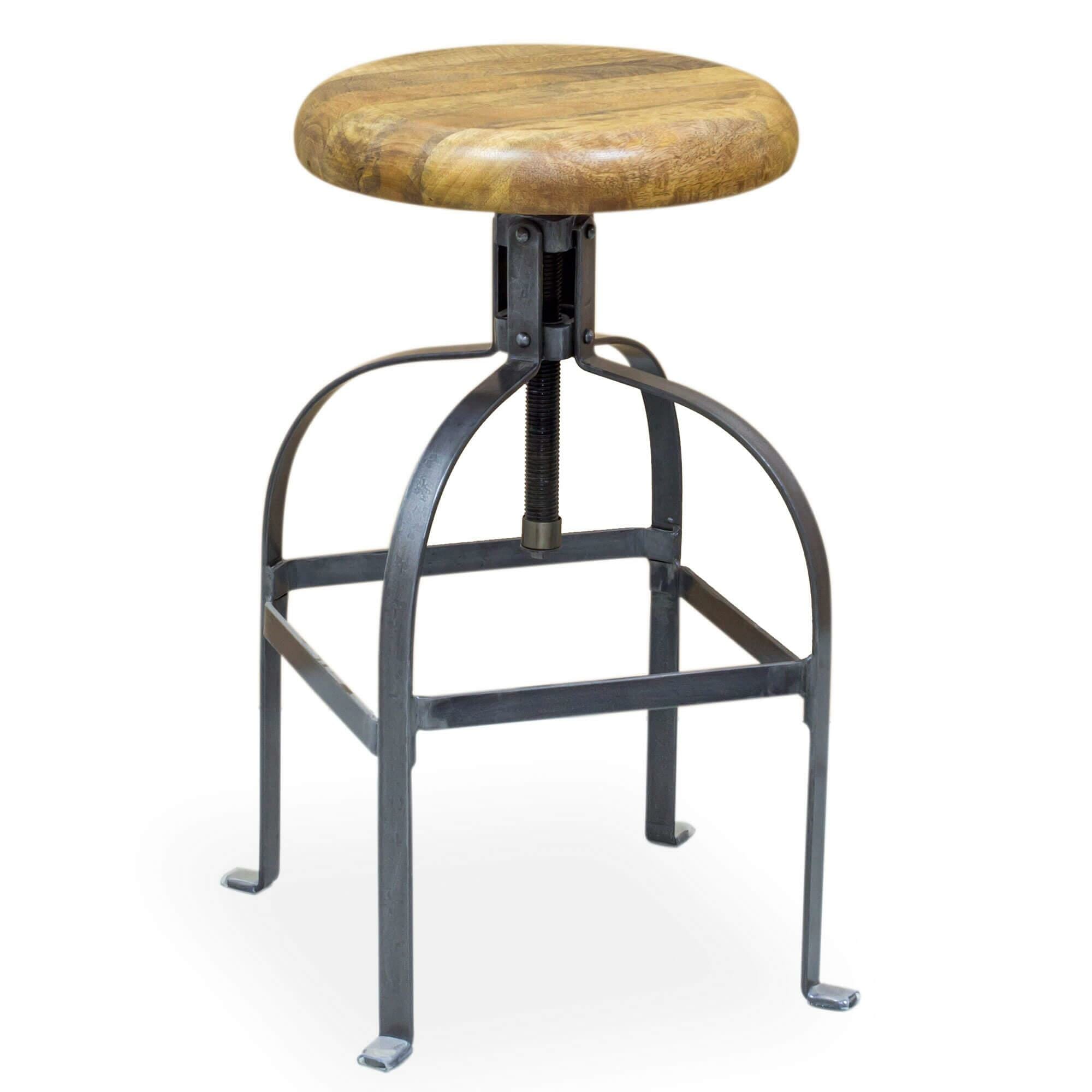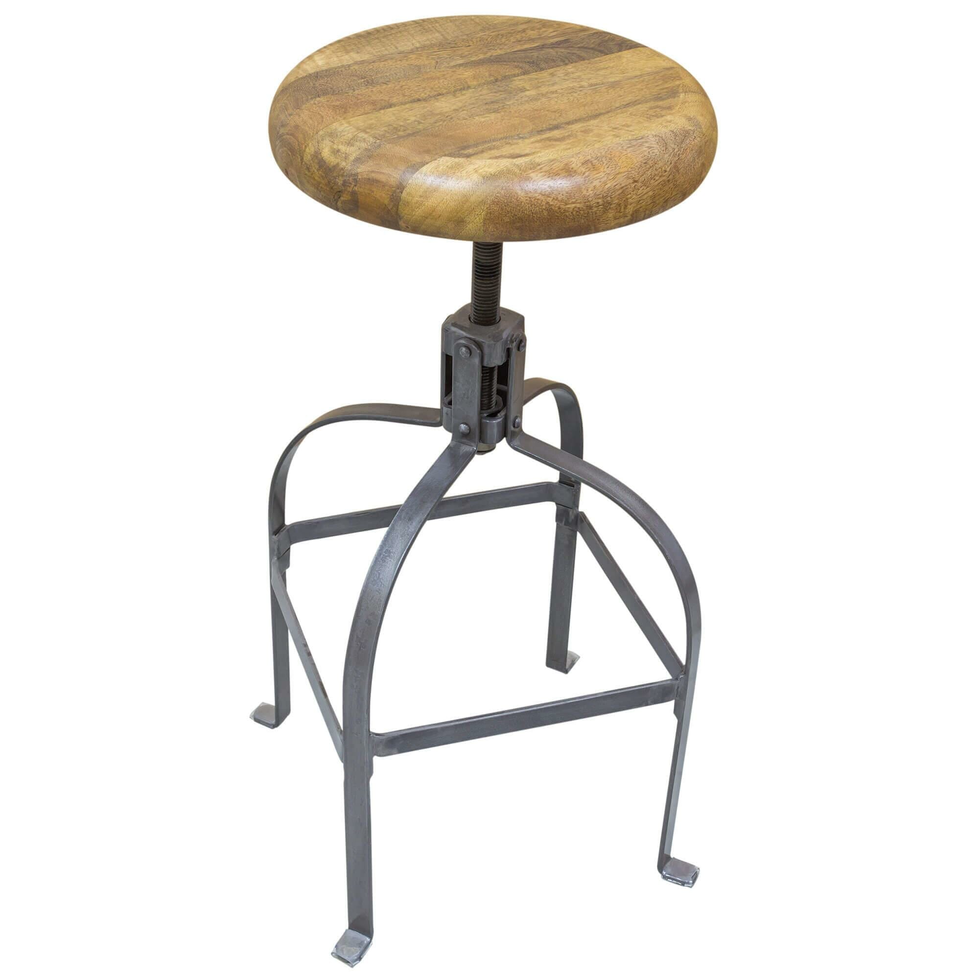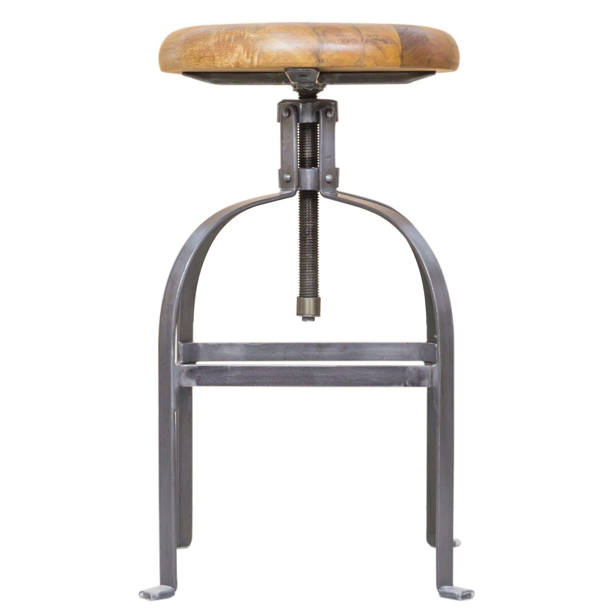 Industrial Urban Nothing says loft living with more immediacy than the dentist stool with a seat that adjusts on a visible industrial screw. Seat in Mango Wood on steel legs with cross-bars. Seat Height adjustable from 60 to 75 cm.