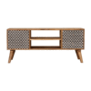 The Valentina Entertainment Unit is a beautiful piece of furniture that will add style and functionality to any home. The two doors feature a black-and-white screen printed pattern that is both eye-catching and stylish. The solid wood structure is made from mango wood and is crafted by hand, making it a unique and high-quality piece of furniture. The oak-ish finish gives the unit a warm and inviting look, while the white & black screen printed doors add a touch of elegance.